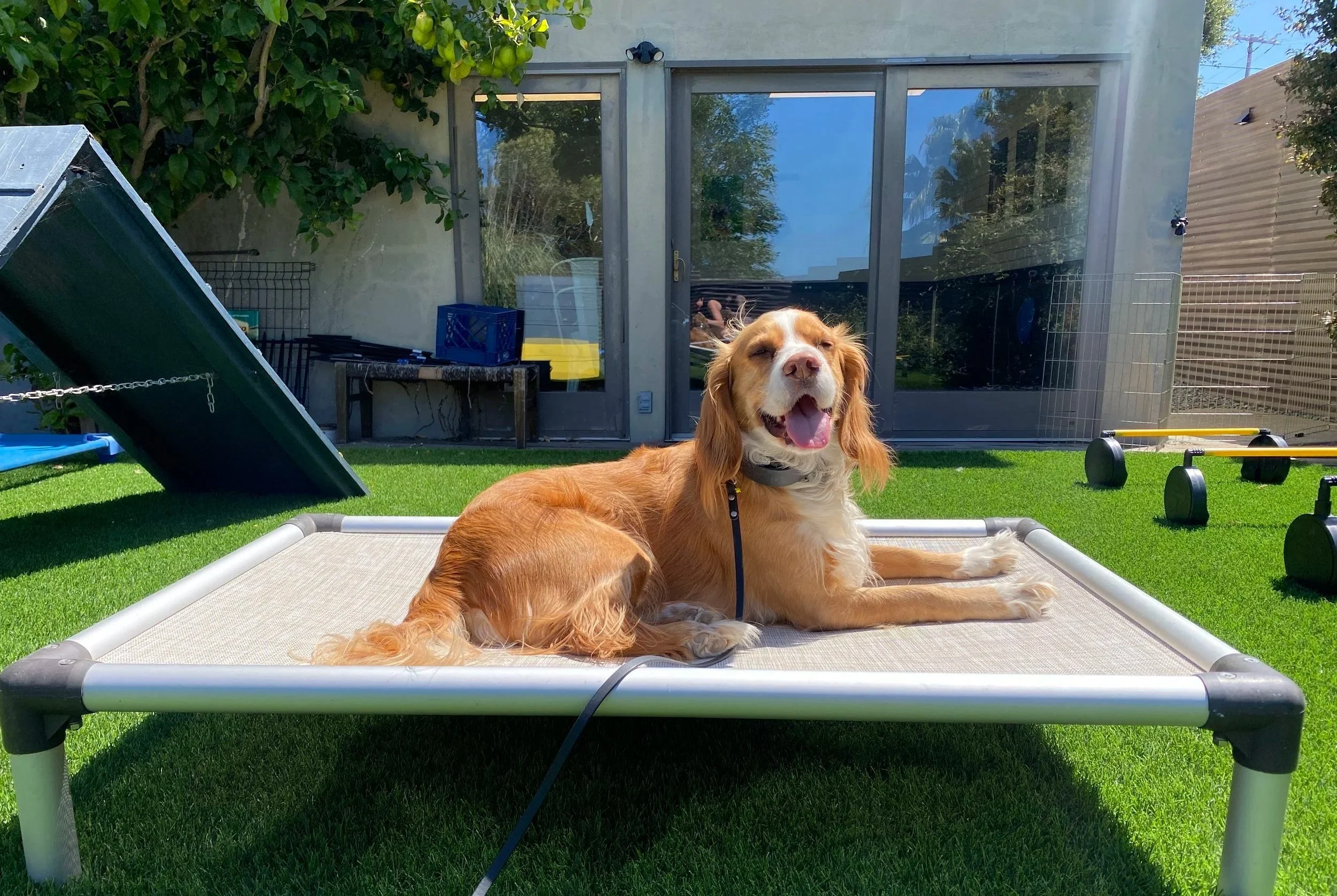 Boarding at facility includes access to two training rooms, a crate room where our dogs sleep at night, multiple fenced indoor and outdoor play yards, an agility yard, a private dog run with their own beds and fresh water, and photos of your dogs having fun. Pick your dog up before 10am and that days on us!